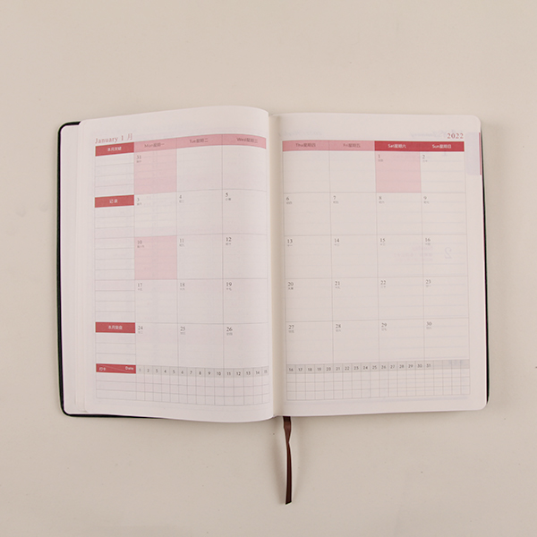 For this hardcover notebook planner, there are three printing options: monthly planner, weekly planner and daily to do list. We can print any one of these designs individually,  or mix and print all three into a notebook planner, even a notebook planner with different designs on every single page. Our clients often customize the inner page design according to their market requirements. Our experienced designers will fully support to complete the designs according to the clients' demand. And these kinds of customized notebooks always achieve very good sales in the final consumer market.